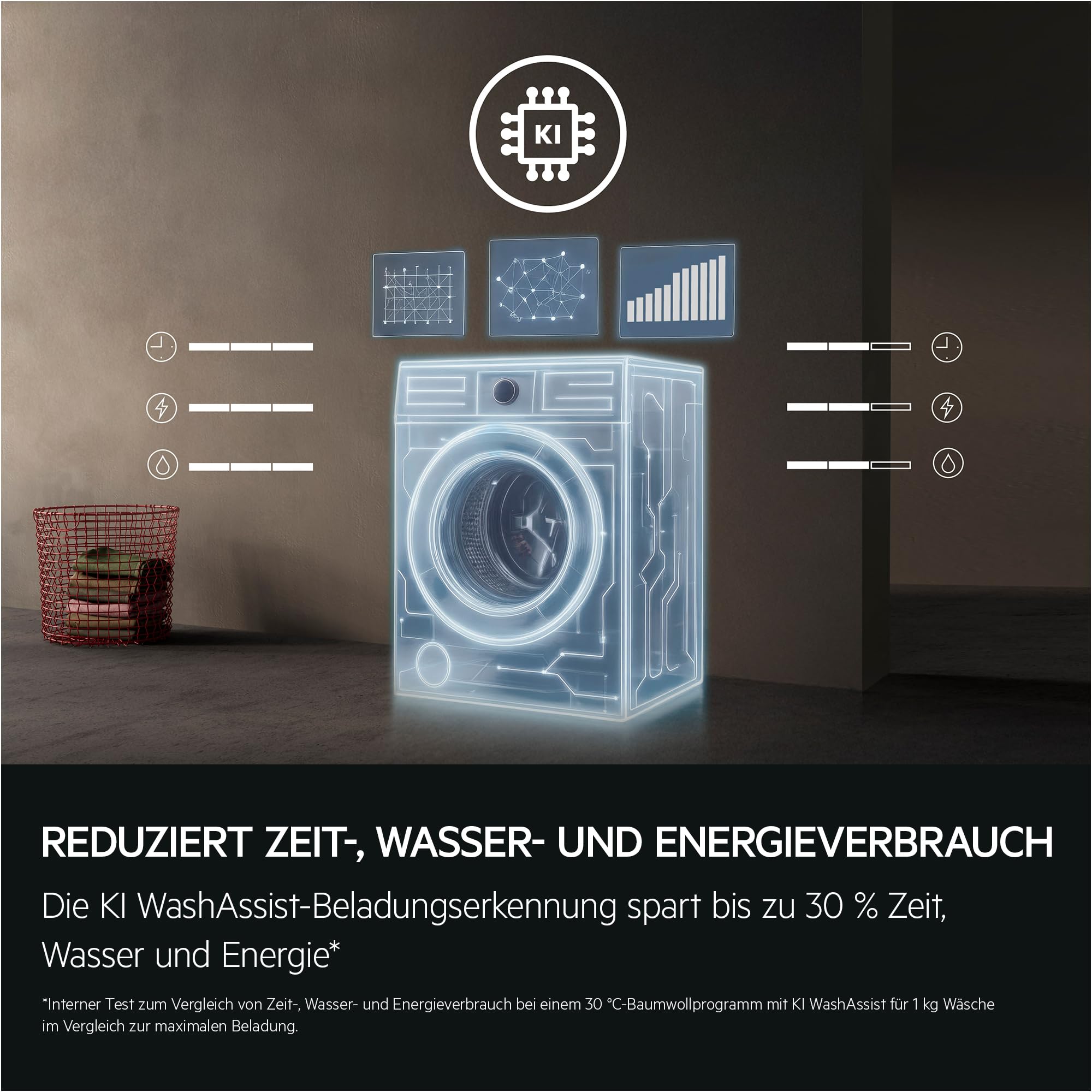 • KI-TECHNOLOGIE FÜR BIS ZU 30 PROZENT ENERGIEERSPARNIS BEI 30 °C – erkennt die Beladung und optimiert automatisch Laufzeit, Wasser- und Energieverbrauch –. Der smarte KI Waschassistent sorgt für effizientes Waschen ohne Aufwand