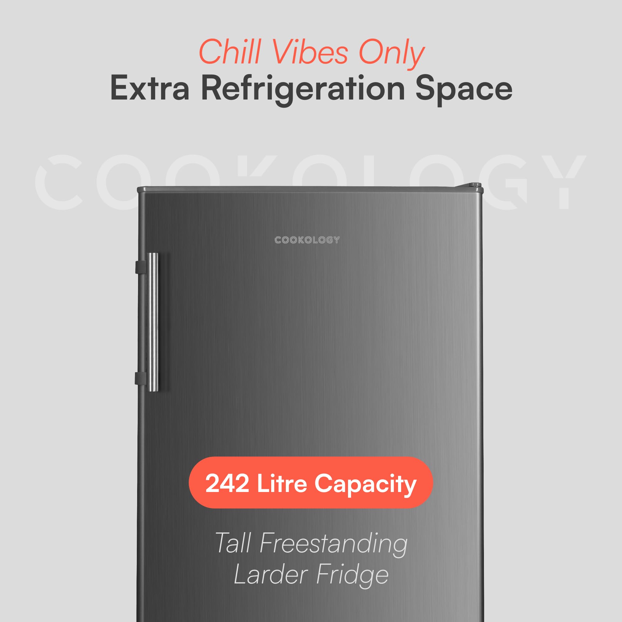 - Introducing the Cookology CTFR240IX Tall Freestanding Larder Fridge, a premium appliance designed to meet your refrigeration needs with utmost efficiency and style. Boasting a generous capacity of 240 litres, this fridge stands tall at 143cm and measures 55cm in width, providing ample space for your groceries and perishables.