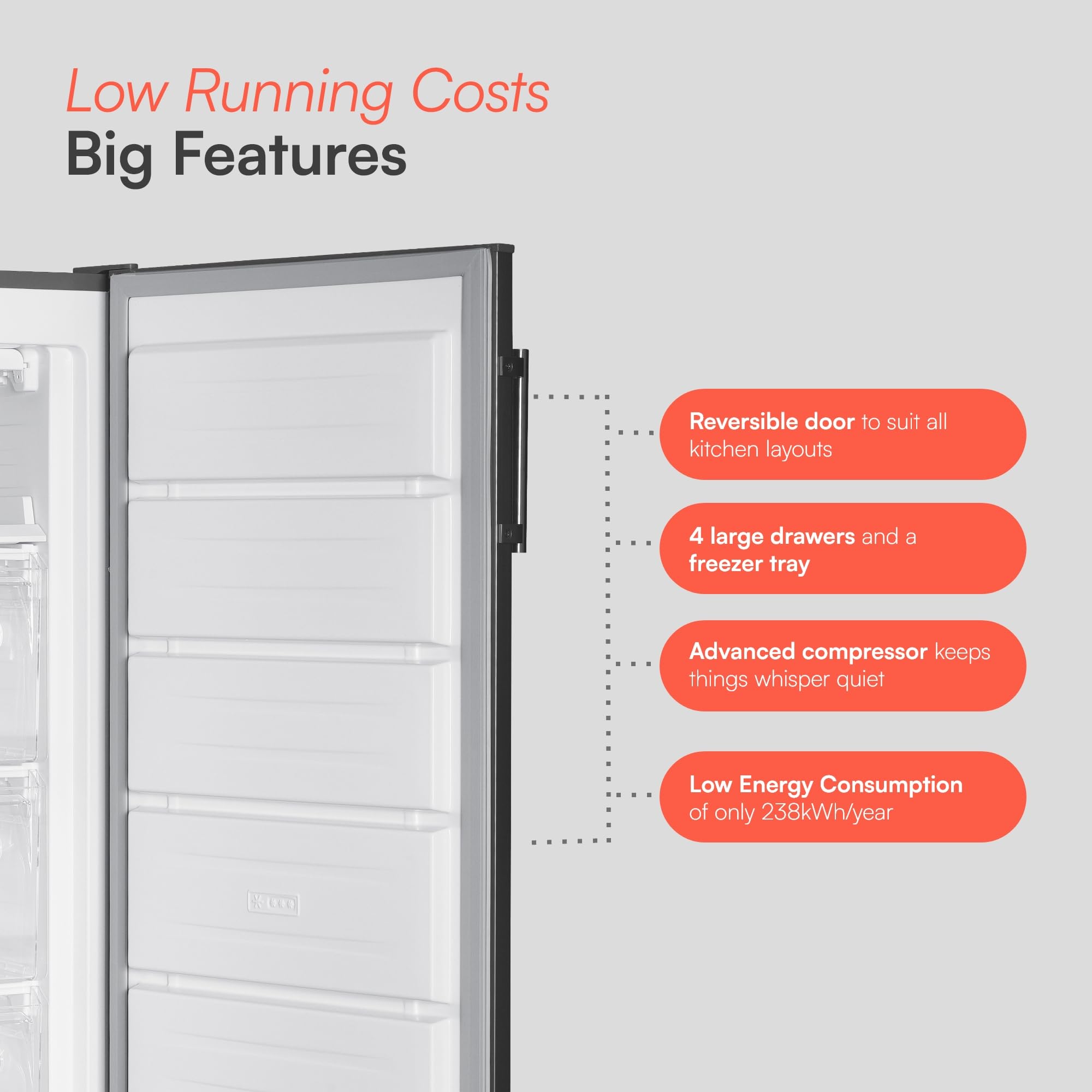 - SPACIOUS STORAGE: The tall freezer is designed with storage in mind, featuring 5 large drawers, allowing you to store and organise your food with ease. The 5 drawers give you enough storage for 9 bags of groceries.