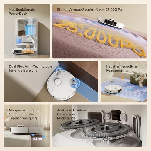 - Leistungsstarke 25.000 Pa-Saugkraft: Leistungsstarke Reinigung von Hartböden und Teppichen mit einer Saugkraft von 25.000 Pa und 5 Saugstufen für eine individuelle Reinigung in Ihrem gesamten Zuhause.