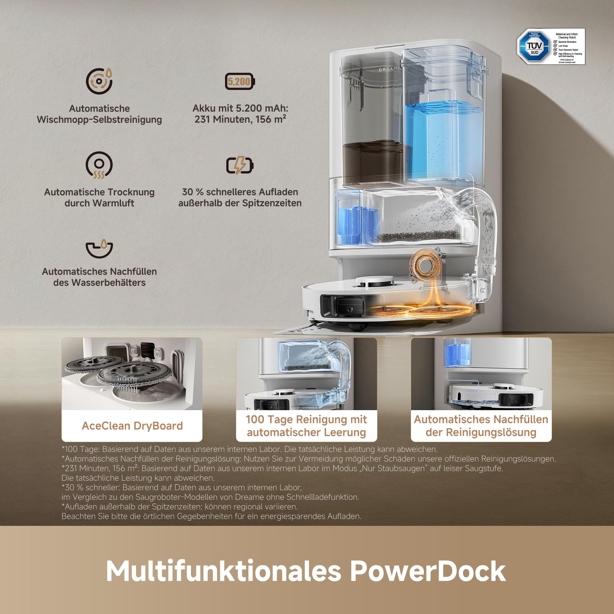 - Aufladen außerhalb der Spitzenzeiten spart bares Geld: Genießen Sie im Leise-Modus eine Reinigung für bis zu 231 Minuten und 156 ㎡. Der robuste Akku mit einer Kapazität von 5.200 mAh wird um 30 % schneller aufgeladen und unterstützt ein Aufladen außerhalb der Spitzenzeiten.