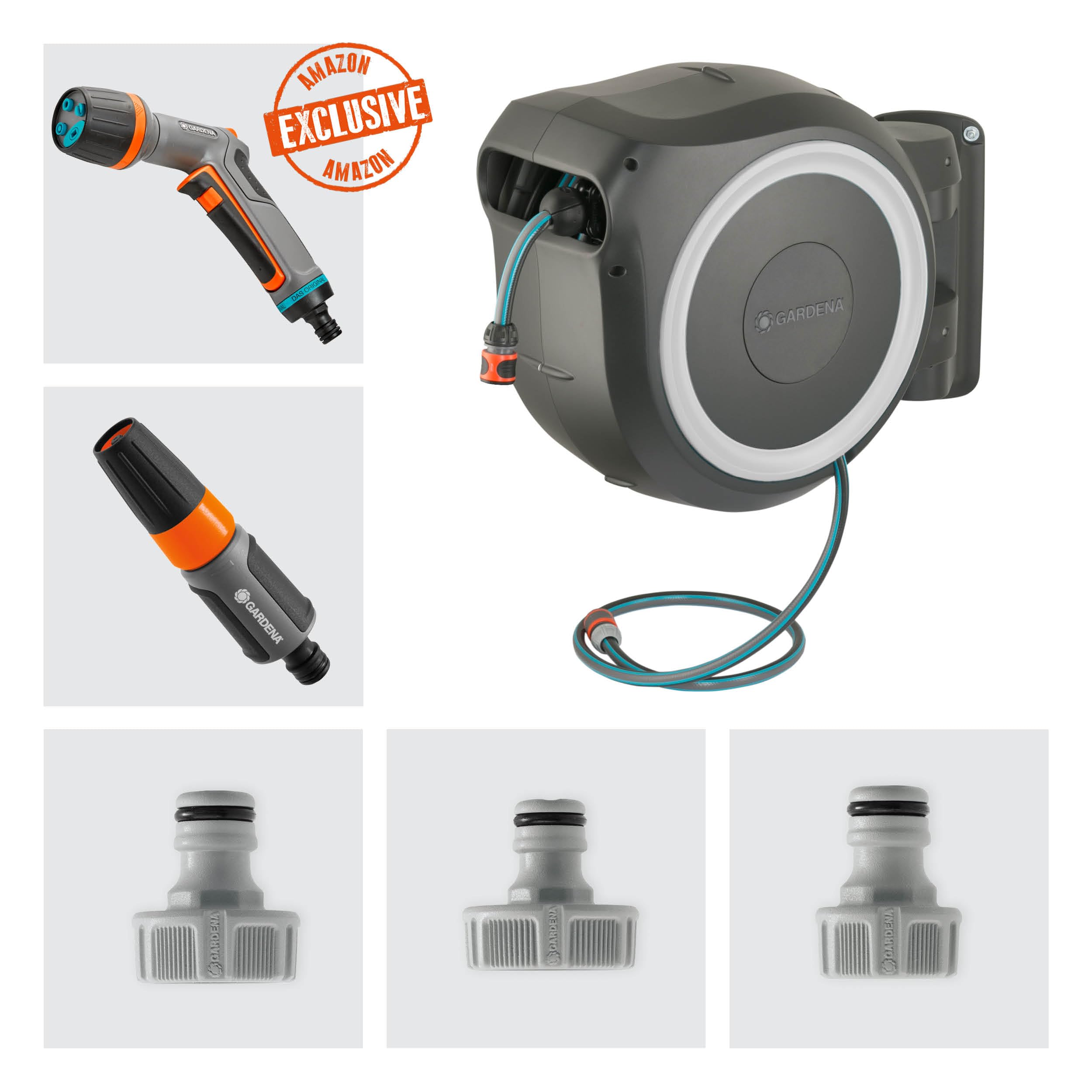 • Lieferumfang: 1x Gardena Wand-Schlauchbox, 1x 30 m Gardena Qualitätsschlauch (13 mm), 1x Anschlussschlauch, 1x Reinigungsspritze, 1x Comfort Multi-Reinigungsspritze, 1x Wandhalterung mit Schrauben, Dübeln und Montagehilfe