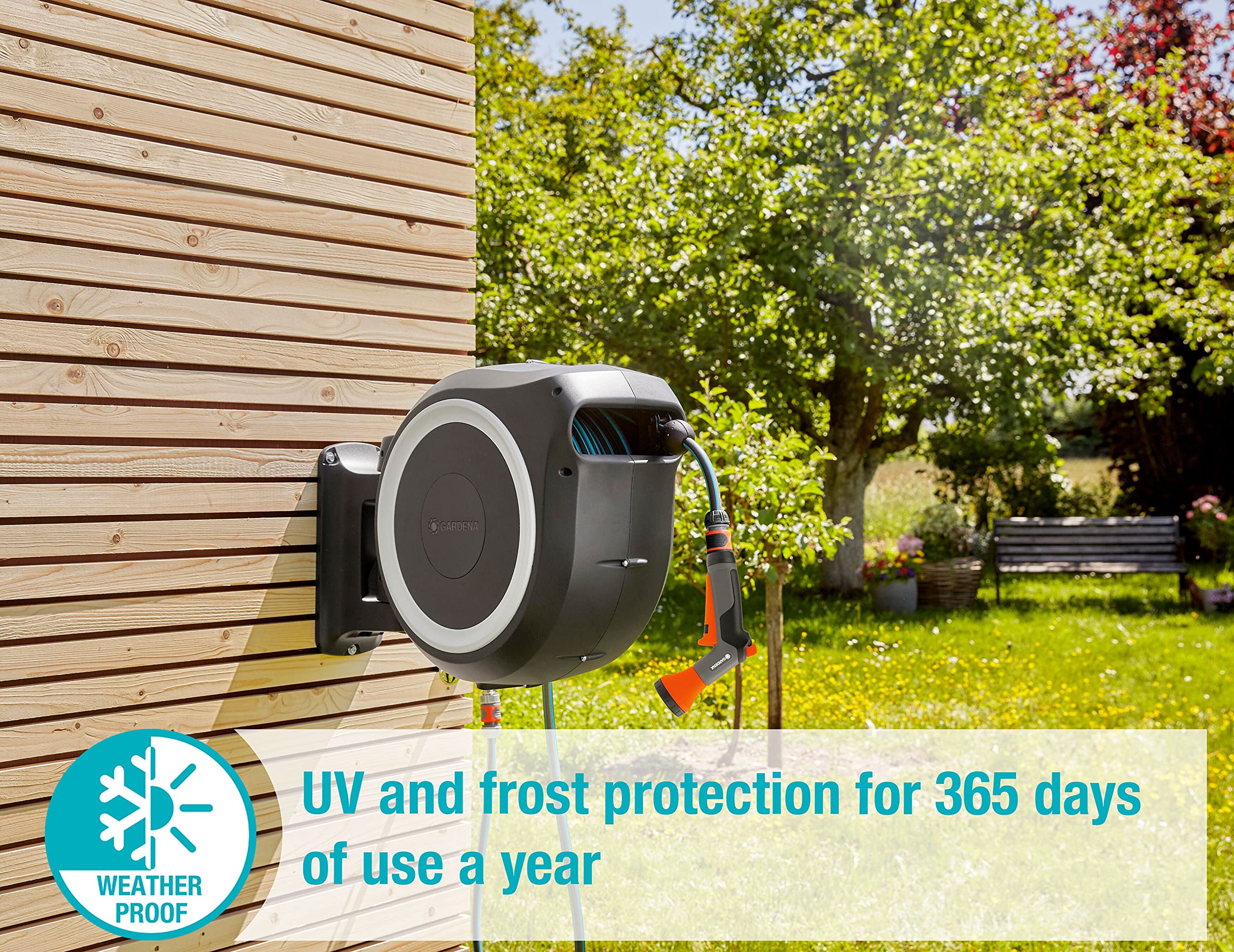 Langlebige Aufroll-Technologie: Automatisches, sicheres und zuverlässiges Aufrollen dank Fliehkraftbremse und integrierter Schlauchführung – gleichmäßiger Einzug ohne dass sich der Schlauch verknotet oder abknickt. Platzsparende und flexible Aufbewahrung: Die Box ist um mehr als 180 Grad schwenkbar und zur Wandmontage geeignet – an der Wandhalterung lassen sich Spritzen, Brausen und Waschbürsten griffbereit aufbewahren. Bequem & einfach: Kein Bücken, kein Kurbeln und keine schmutzigen Hände, das schätzen Gärtner an den Gardena Wand-Schlauchboxen – zusätzlich werden lästige Stolperfallen durch einen herumliegenden Schlauch verhindert. Frostsicher: Dank innovativer Gardena-Frostschutztechnologie ist die Wand-Schlauchbox RollUp frostsicher und kann das ganze Jahr über draußen an ihrem Platz bleiben. Lieferumfang: 1x Gardena Wand-Schlauchbox, 1x 30 m Gardena Qualitätsschlauch (13 mm), 1x Anschlussschlauch, 1x Comfort Multi-Reinigungsspritze, 1x Wandhalterung mit Schrauben, Dübeln und Montagehilfe