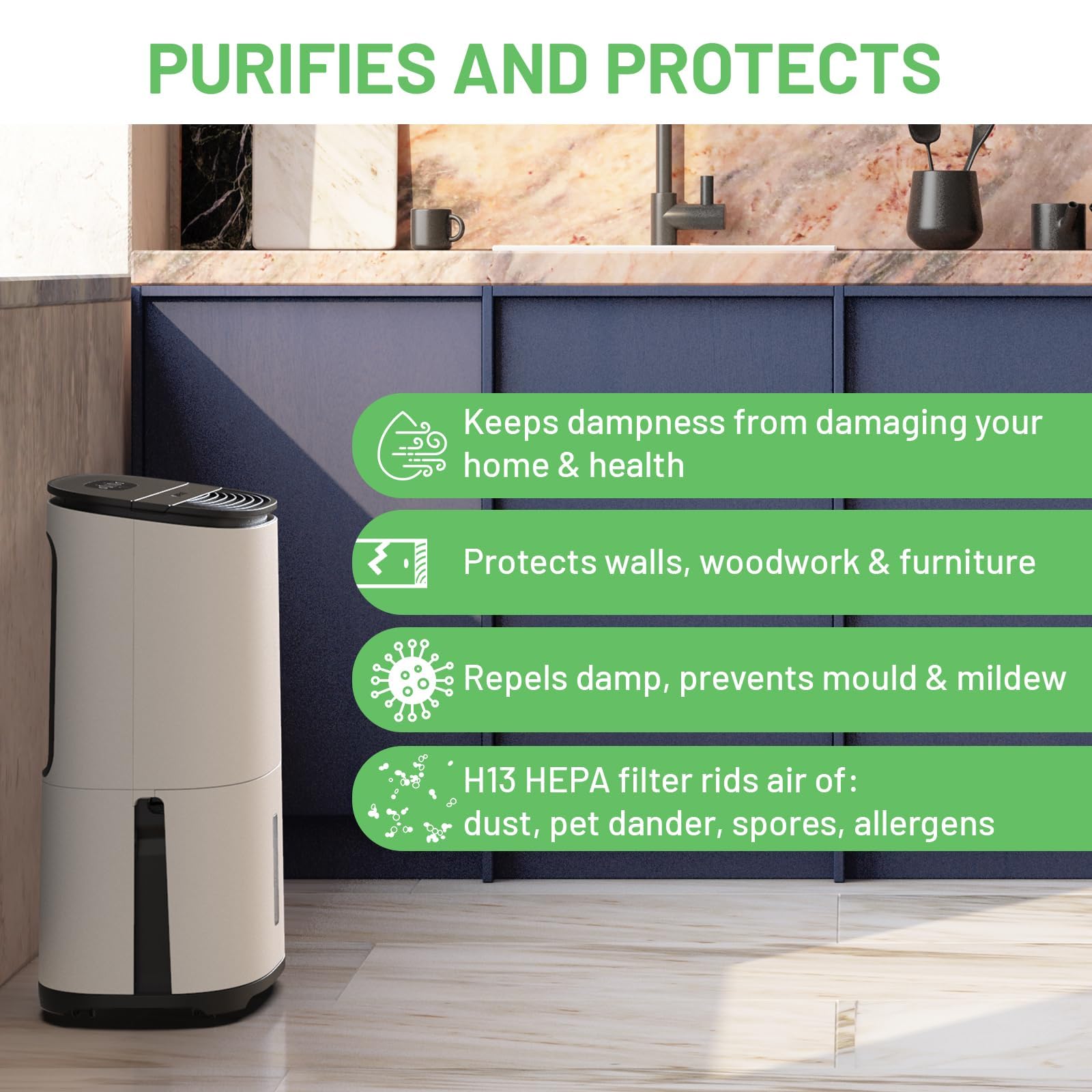 - 2-in1 DEHUMIDIFIER & AIR PURIFIER – The silent dehumidifier not only controls humidity by removing up to 14 L of water per day, but enhances your living environment further with a medical grade H13 HEPA filter for cleansing air; keeping it fresh and clear of nanoparticles such as dust, dander, pollen and other allergens.